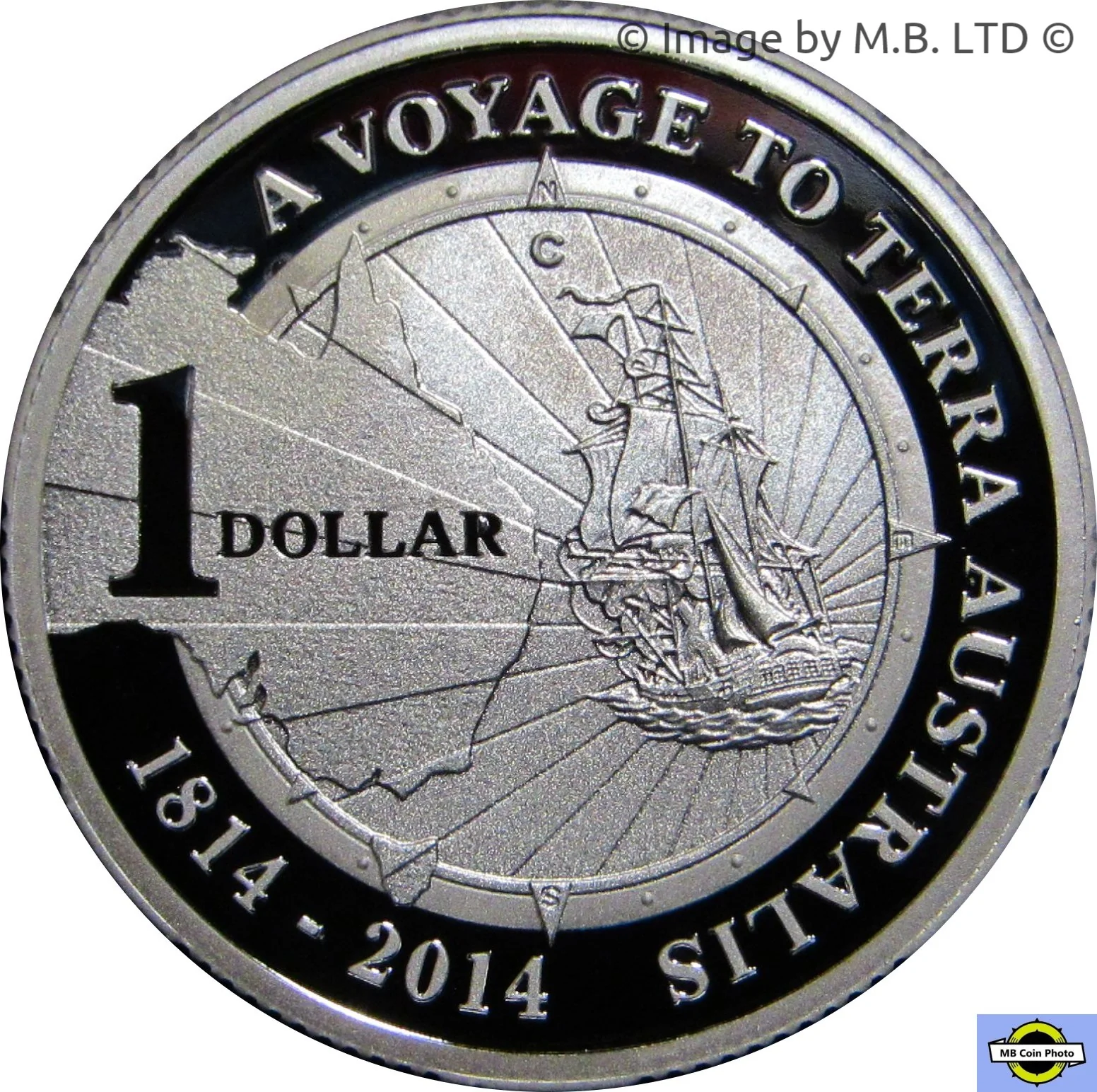 Australia encircled by Matthew Flinders' ship and a compass.