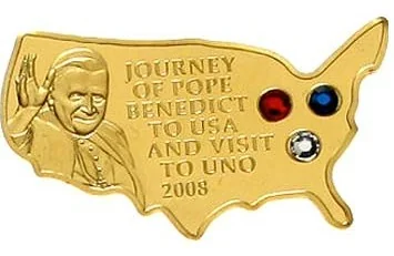 Pope Benedict XVI wearing a mitre with three American-flag-colored Swarovski crystals.