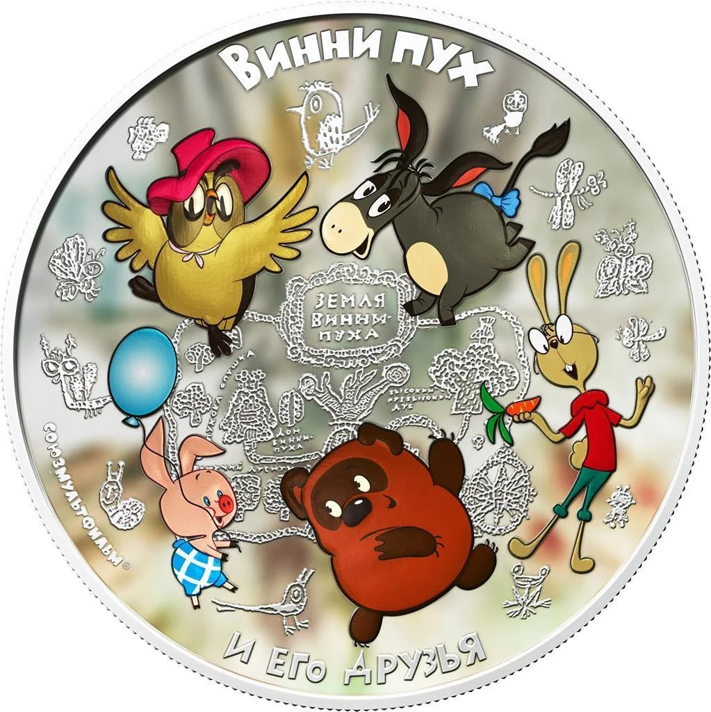 Five Russian Winnie-the-Pooh characters: Eeyore, Rabbit, Pooh, Piglet, Owl.