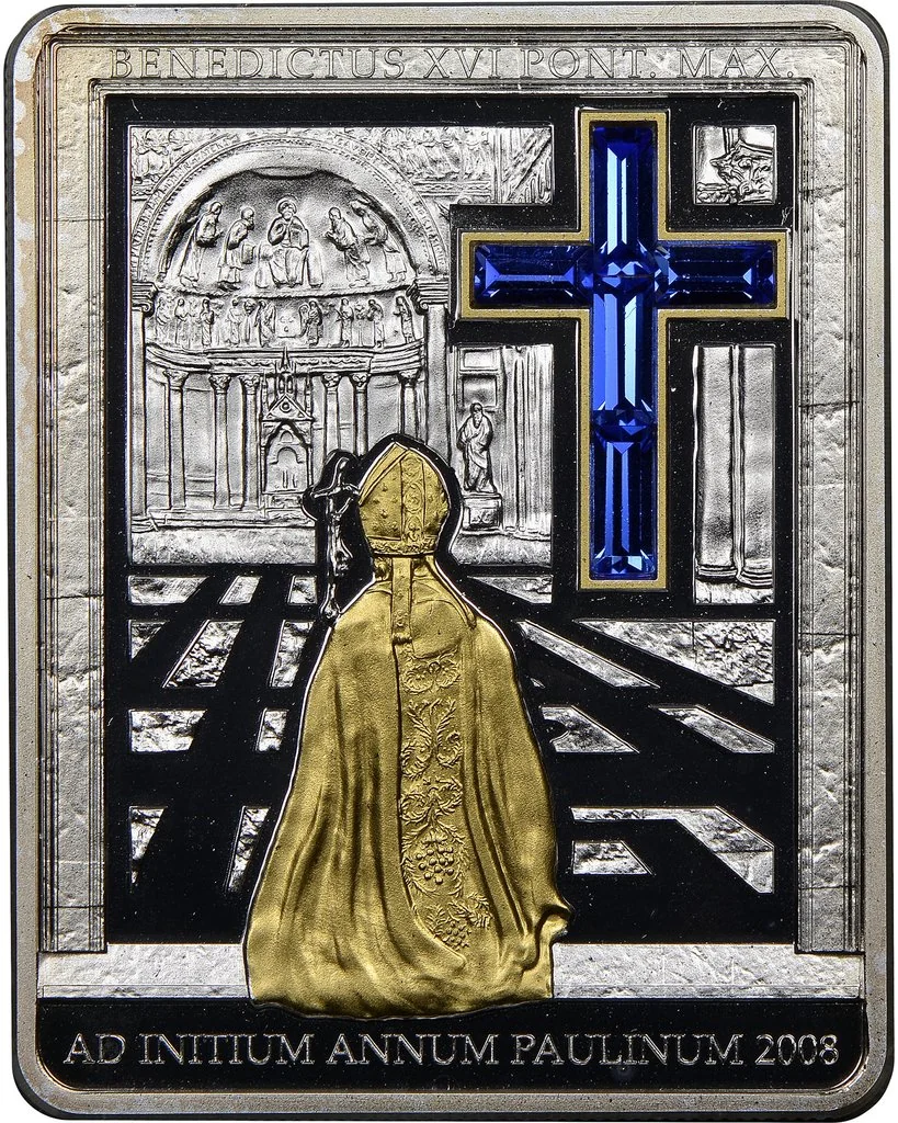 Pope Benedict XVI in St. Peter's Basilica with a five-crystal blue cross.
