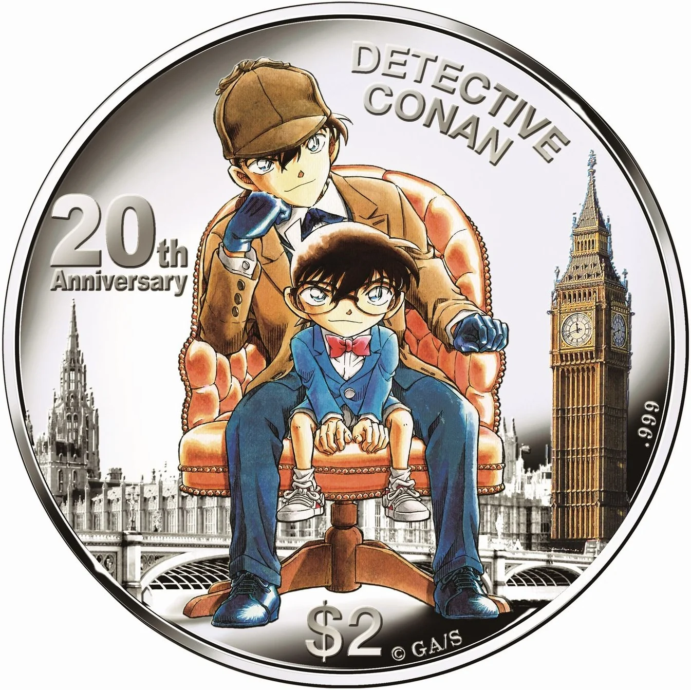 Conan, dressed as Sherlock Holmes, meets Shinichi before a silver-hued London backdrop featuring Big Ben.