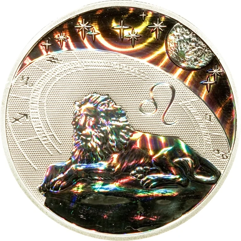 Seated left-facing lion on disc with zodiac signs, topped by stars and globe.