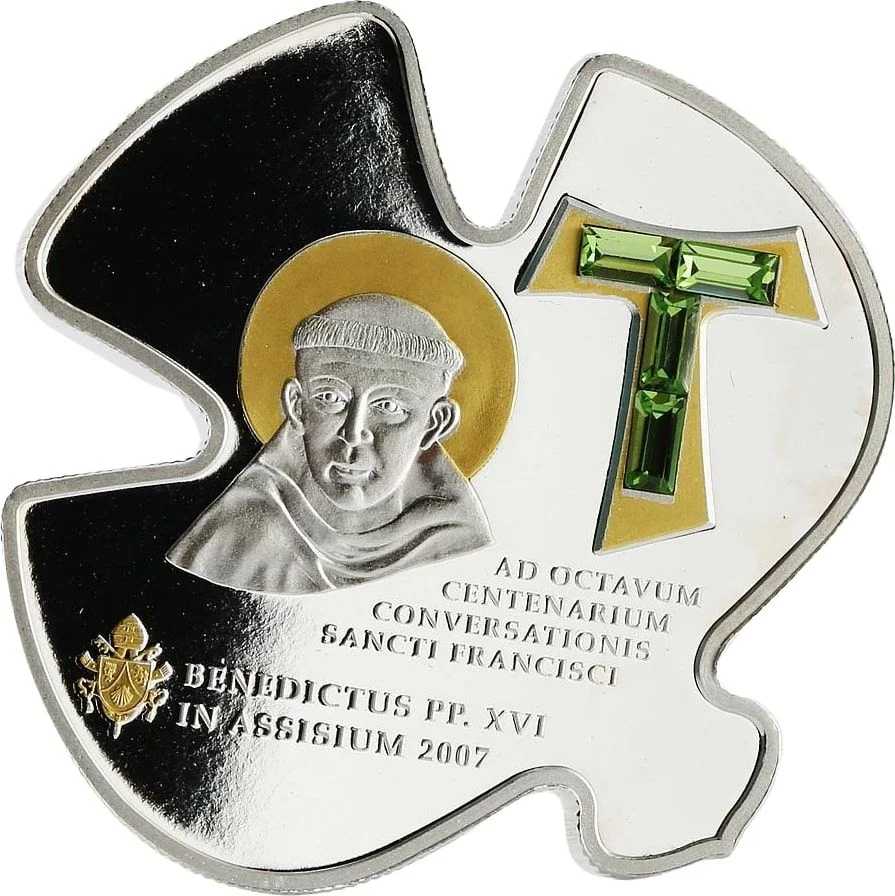St. Francis tau cross, gilt accents, crystal inset.