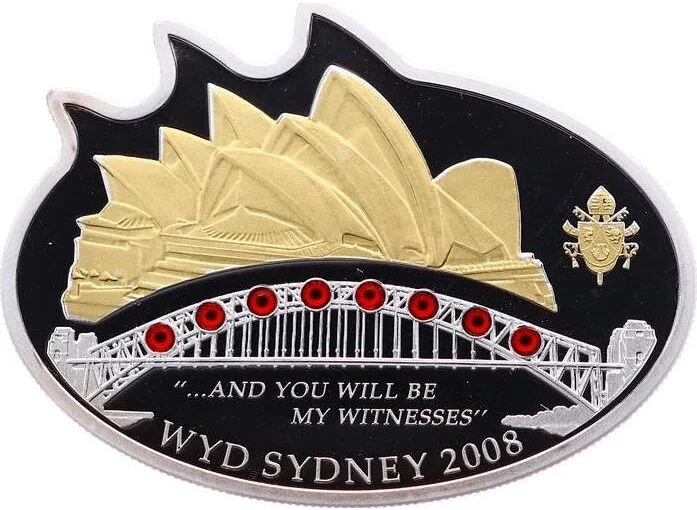 Gilt Sydney Opera House, papal arms, Sydney Harbour Bridge with eight red crystals.