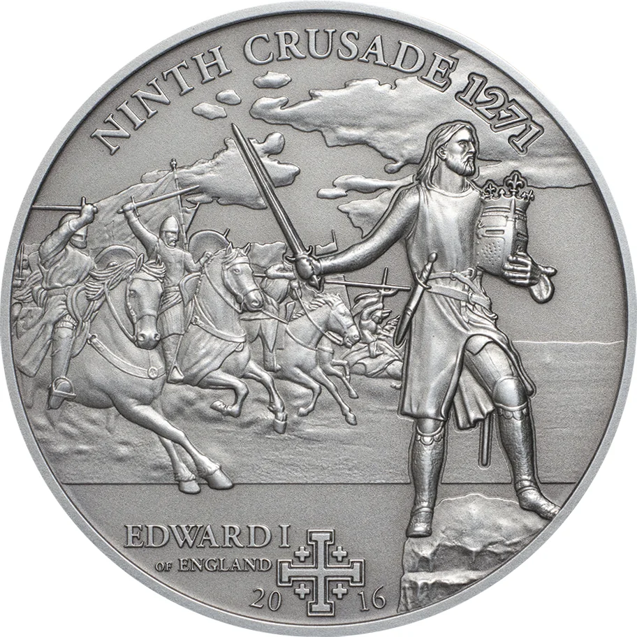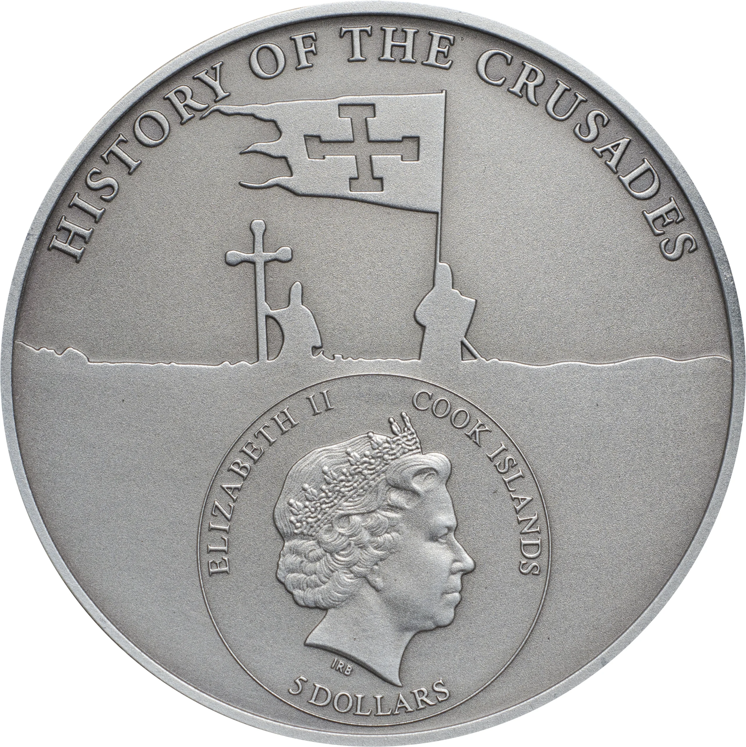 Templar silhouettes with banner and cross above; Queen Elizabeth II effigy below.