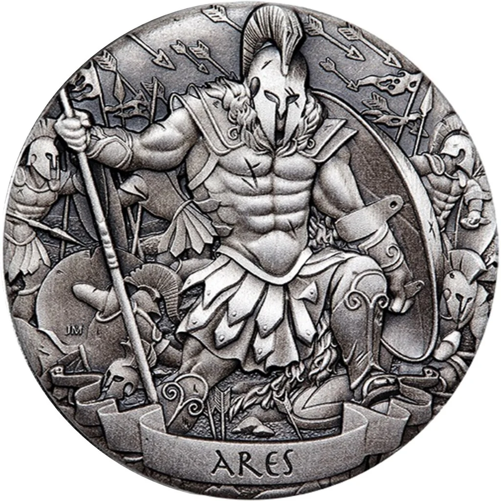 Ares in battle armor, shield raised.