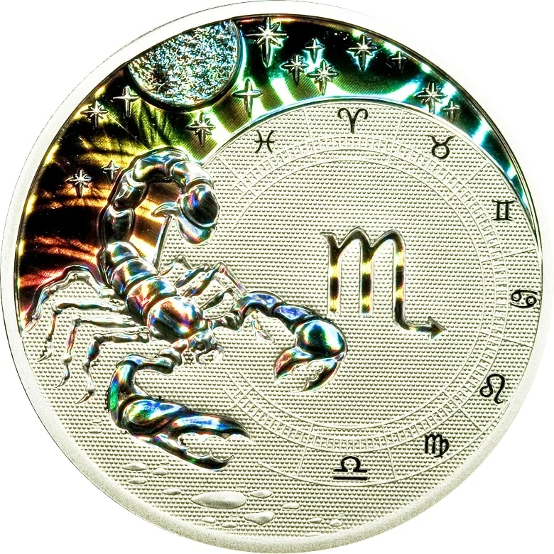 Right-facing scorpion on a zodiac disc, with stars and globe above.