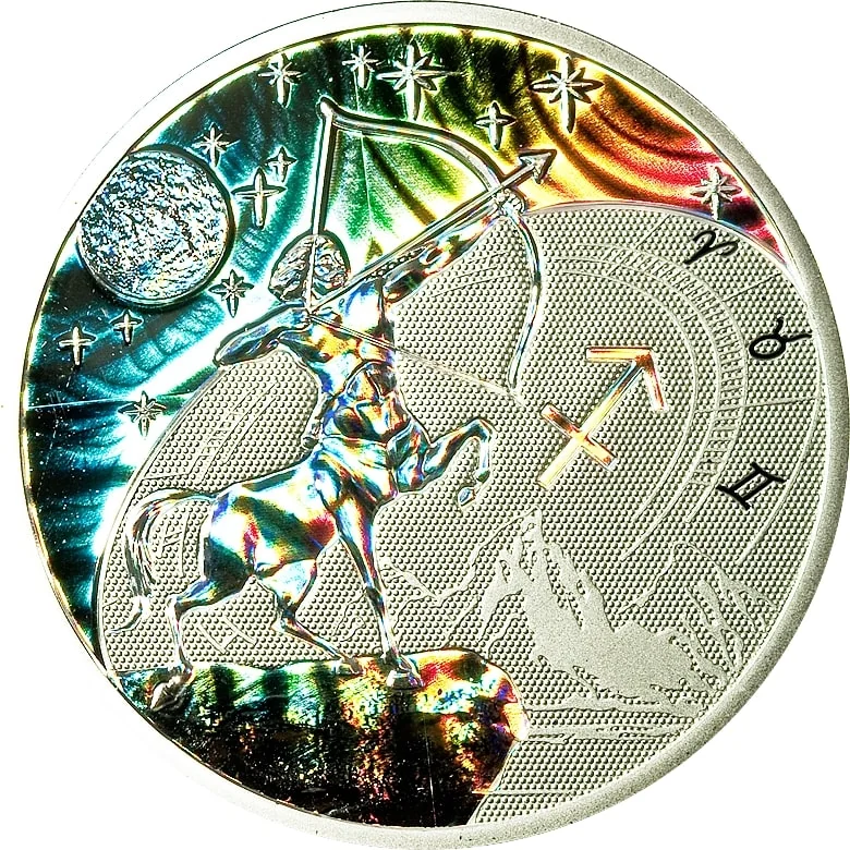 Centaur on rock shooting arrow, with zodiac disc, stars, and globe above.