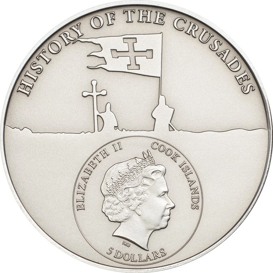 Templar silhouettes with banner and cross above; Queen Elizabeth II effigy below.