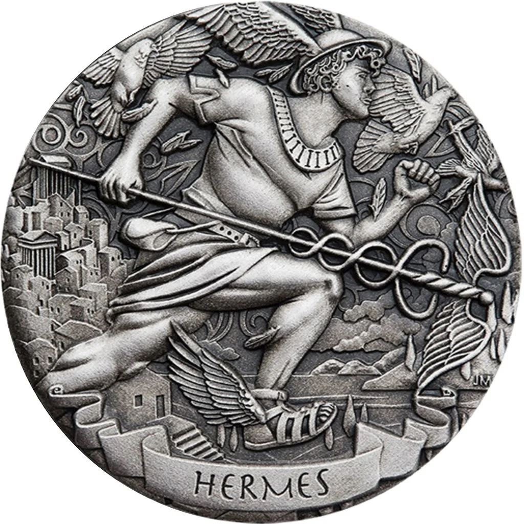 Hermes, wearing his winged hat, talaria, and short robe, carries his kerykeion and pouch as he runs past an ancient Greek city.