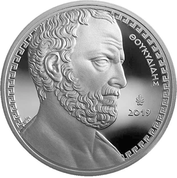 Portrait of Thucydides facing right, based on a 4th-century BC bust. Greek text "THUCYDIDES" is to the upper right, with the year "2019" and mint mark near the centre right. The design is encircled by a traditional meander pattern.