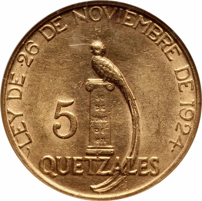 Bank of Guatemala (a precursor to the modern central bank) as the sole issuer of currency and pegged the quetzal to the U.S. dollar at 1:1, fully convertible to gold. By 1926, the new system was being consolidated; silver pesos were being withdrawn from circulation and the first series of quetzal banknotes and coins were becoming the official legal tender. This shift was part of a broader regional trend of "Kemmerer missions" that sought to modernize Latin American economies through orthodox gold-standard policies.