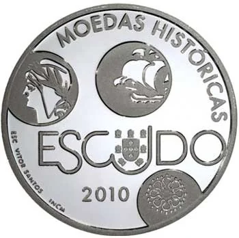 Portuguese coat of arms inside the "U" of "ESCUDO". Features coin symbols, the year 2010, and the inscriptions "ESC VICTOR SANTOS", "INCM", and "MOEDAS HISTORICAS".