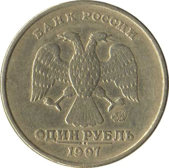 Center: Bank of Russia emblem (two-headed eagle, wings down), denomination, issue year, and mint mark. Mint mark under eagle's right claw.
