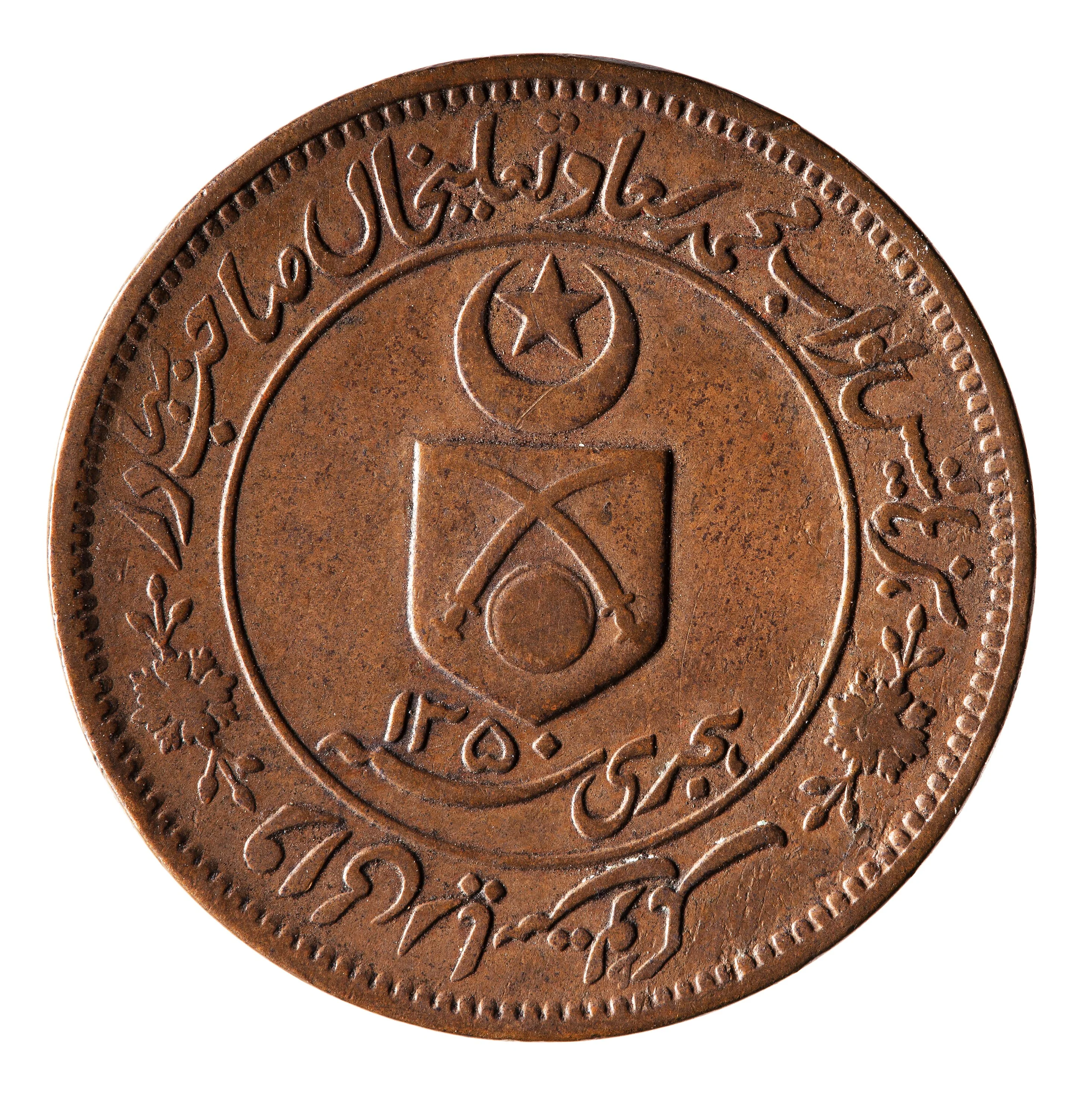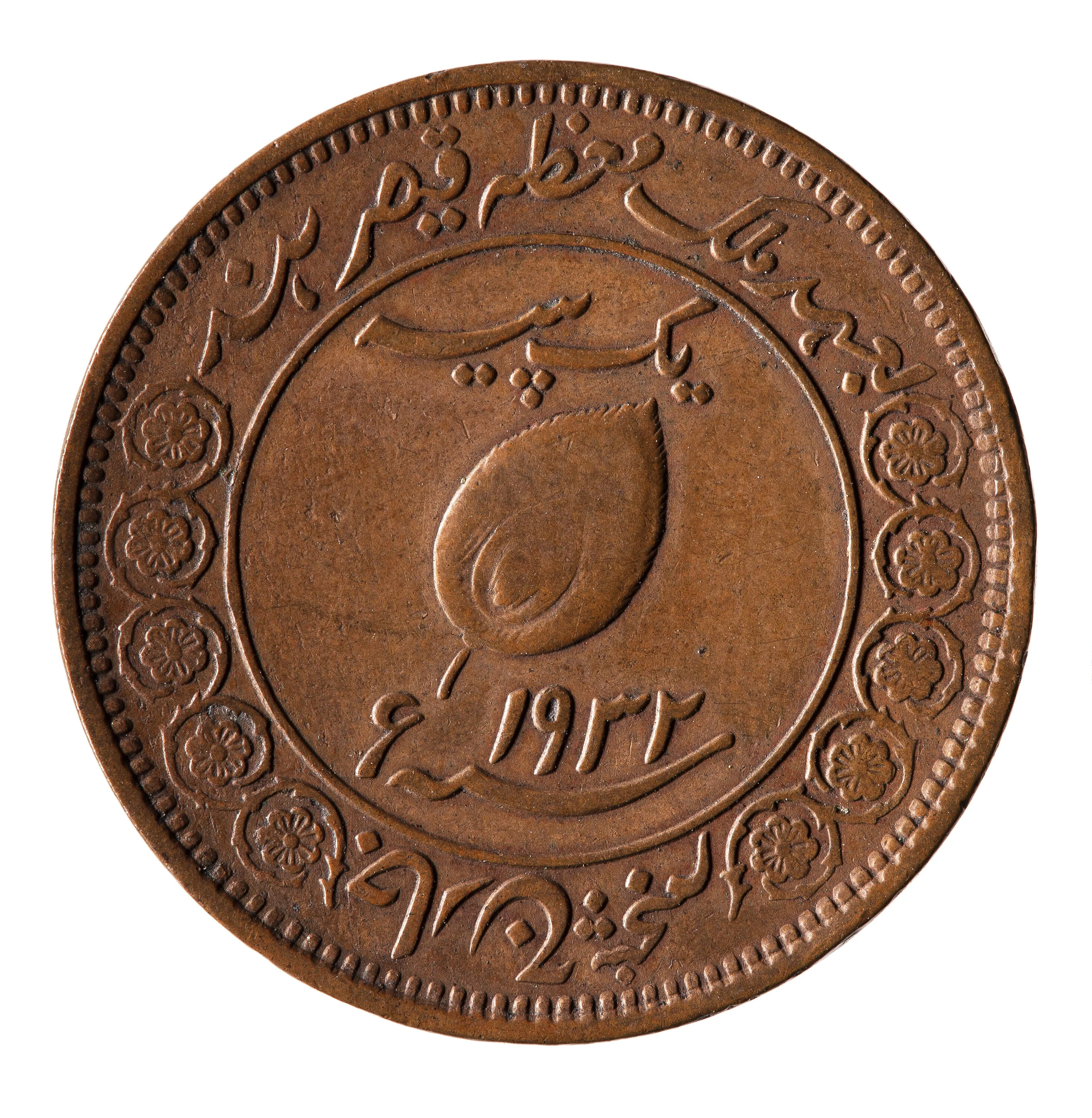 Description: Leaf mark, date below. Pashto legend in circle: "ek paisa" above leaf, "sanah iswy 1932" below. Outer legend: "Bi'ahdi malikah muazam qaiser-i-hind - George pancham".