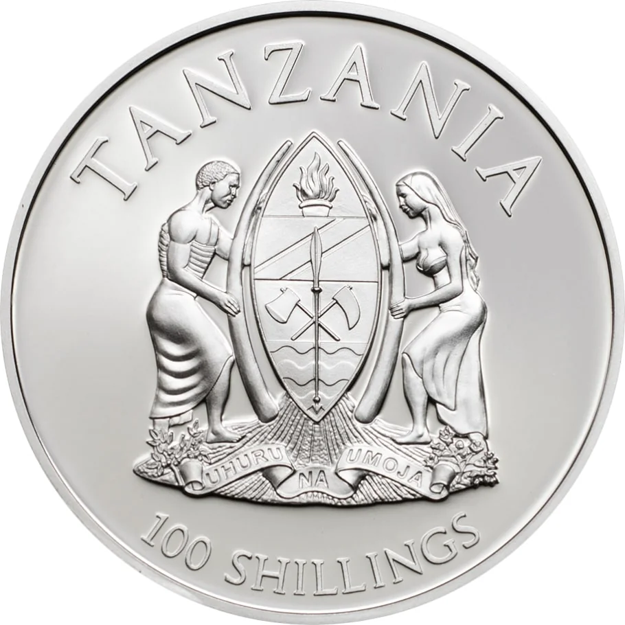 The Tanzanian Coat of Arms features a warrior's shield divided into four sections representing the nation's land, water, people, and wildlife, topped by a flaming torch and supported by an elephant tusk and a clove stem.