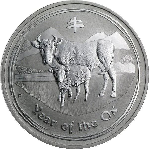 The reverse shows an ox and calf on grass with hills behind, plus the inscription ‘Year of the Ox’, the Chinese character for ‘ox’, and The Perth Mint’s ‘P’ mintmark.