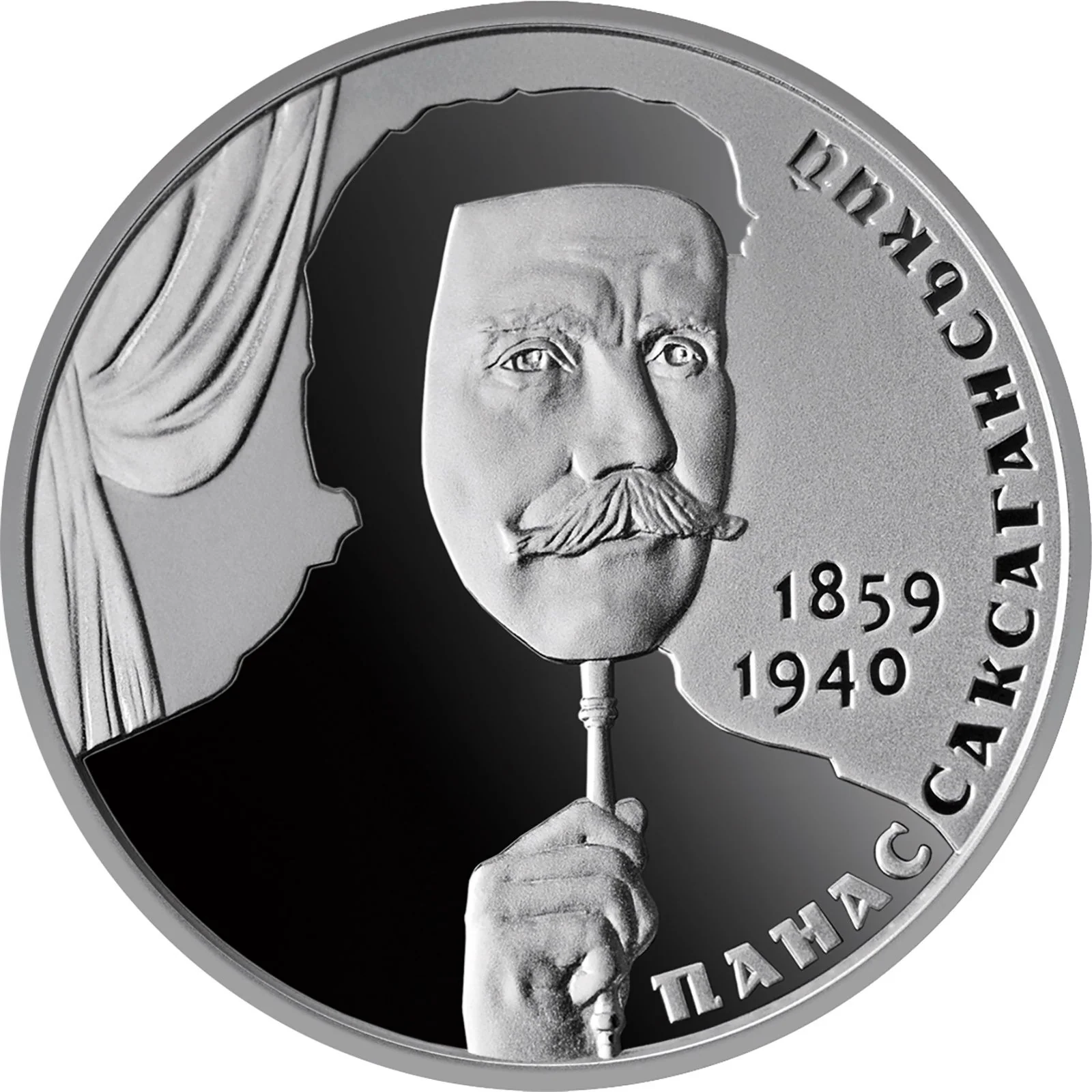 A stylized outline of the actor holding a mask, symbolizing his quote on pretense and self-portraiture. Theater drapes frame the left side; to the right are his life dates (1859–1940) and the semicircular legend: ПАНАС САКСАГАНСЬКИЙ.