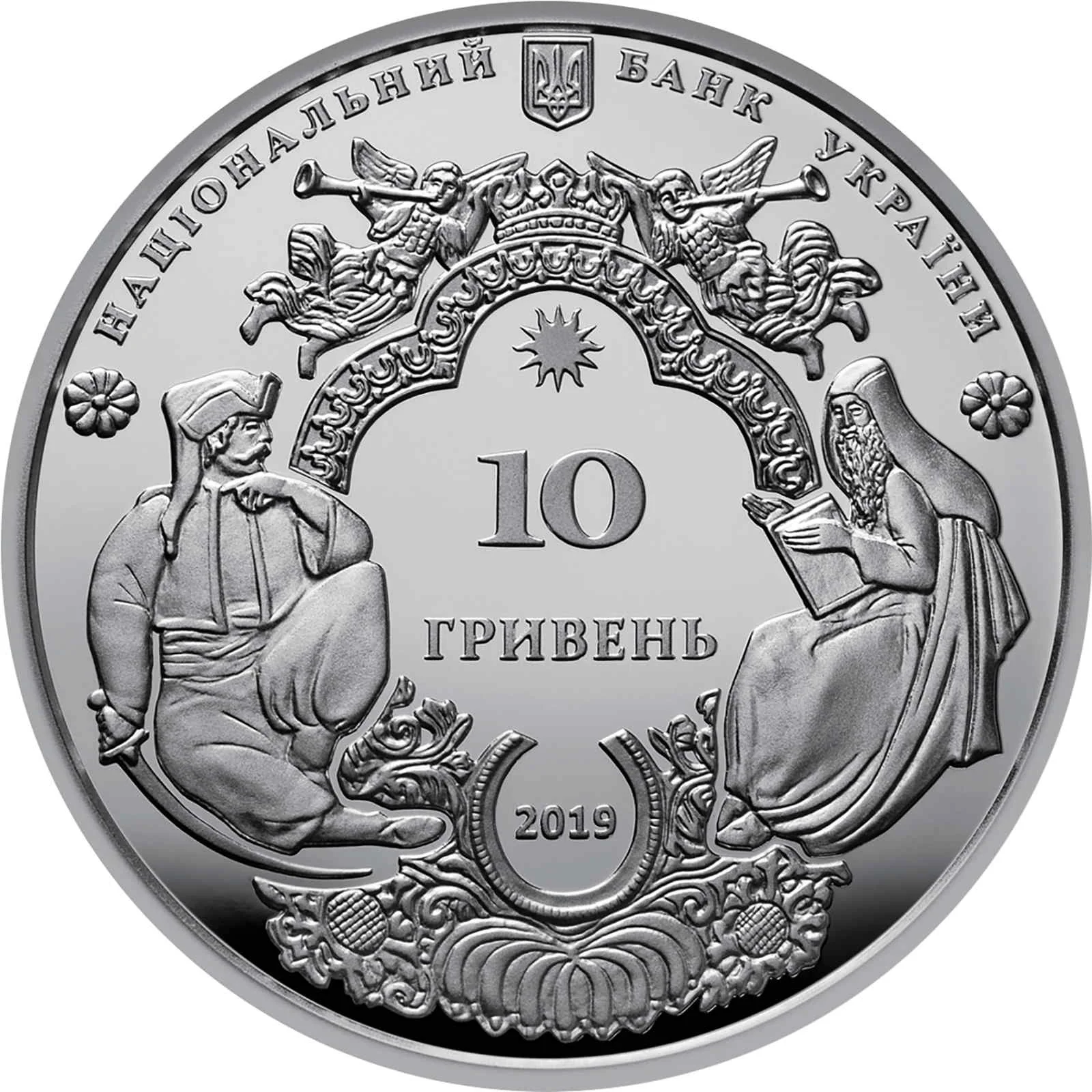 Ukraine's small coat of arms is centered, with "НАЦІОНАЛЬНИЙ" to its left and "БАНК УКРАЇНИ" to its right. The background features a stylized composition of a Cossack (left), a monk (right), Baroque moldings (above and below), the face value "10 ГРИВЕНЬ," and the year 2019.