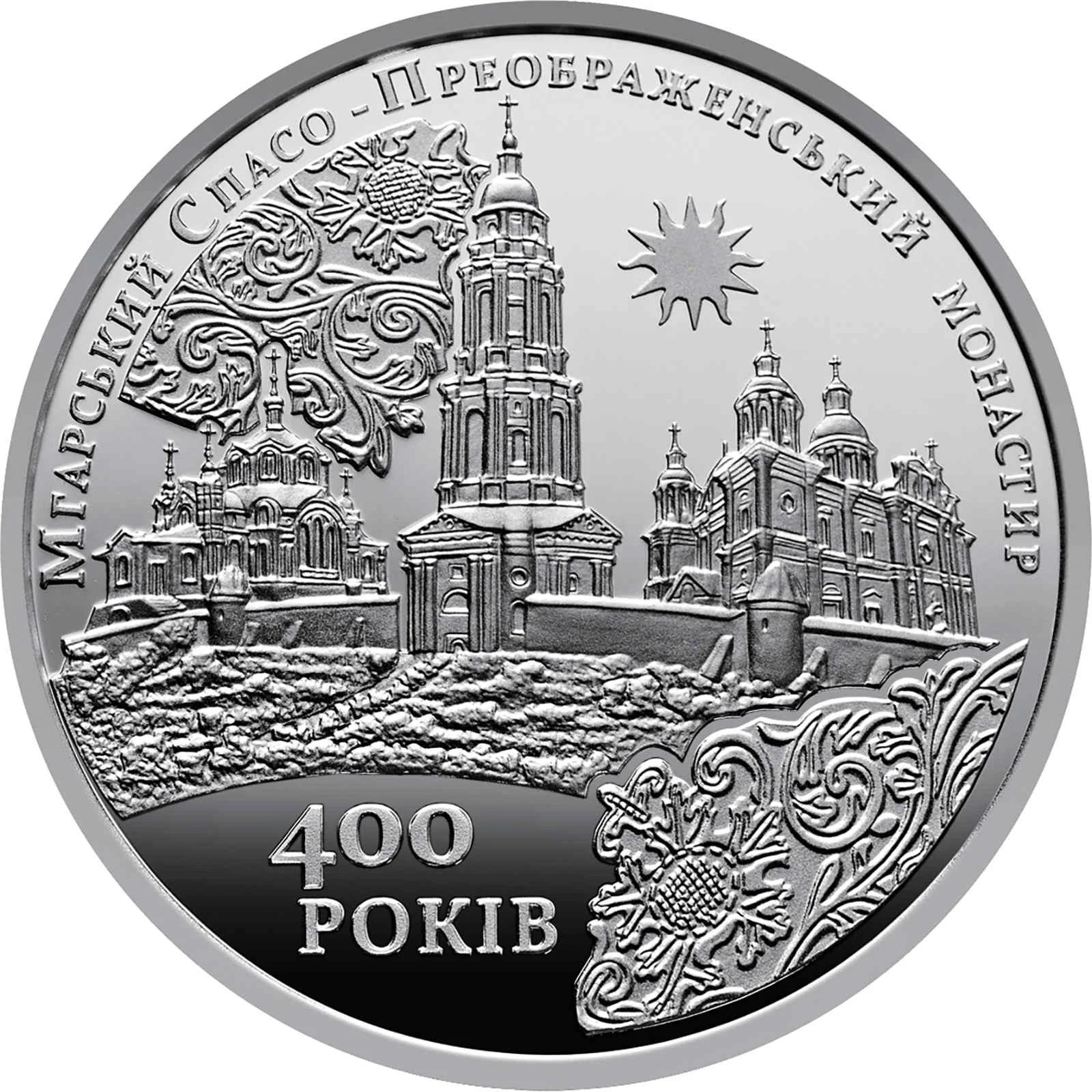 A landscape of monastery buildings with the legends "МГАРСЬКИЙ СПАСО-ПРЕОБРАЖЕНСЬКИЙ МОНАСТИР" (circular, above) and "400/РОКІВ" (below). Baroque floral ornaments appear in the upper left and lower right.