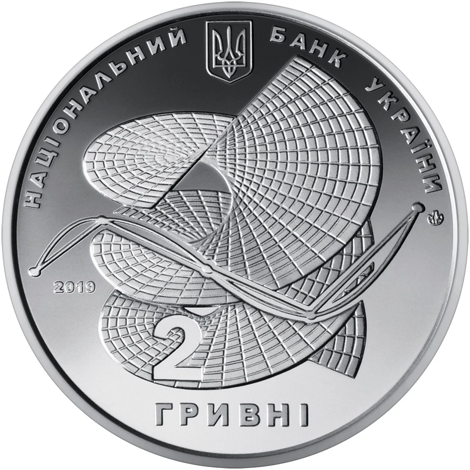 The obverse features Ukraine's small coat of arms with "НАЦІОНАЛЬНИЙ БАНК УКРАЇНИ" around it. The center shows a stylized helicoid with a polygonal curve and the numeral 2. "ГРИВНІ" is at the bottom, with the year 2019 and the mint mark on either side.