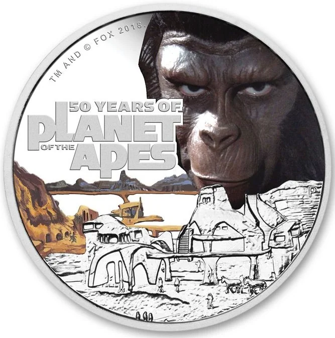 Roddy McDowall as Cornelius from *Planet of the Apes*, reflected over Ape City.