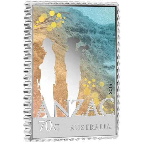 The reverse shows the coloured silhouettes of an Australian and a New Zealand soldier against the Gallipoli hills at Anzac Cove, along with Golden Wattle sprigs, the denomination, and the words ‘ANZAC’ and ‘Australia’.
