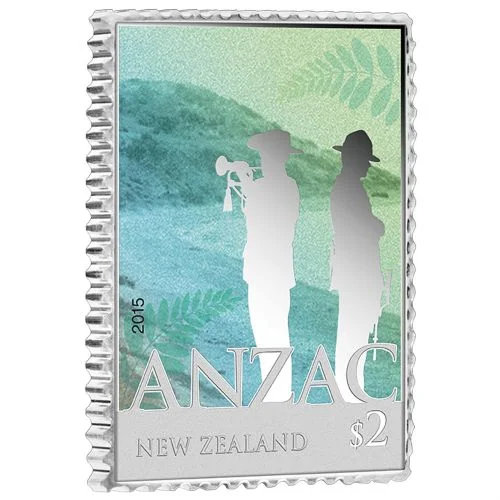 Coloured silhouettes of an Australian and New Zealand soldier at Anzac Cove, with silver fern fronds. Legend and denomination below.