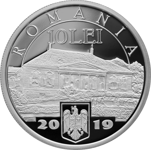 General Berthelot mansion in Hunedoara county, with arched "ROMANIA", 10 LEI value, Romanian coat of arms, and 2019.
