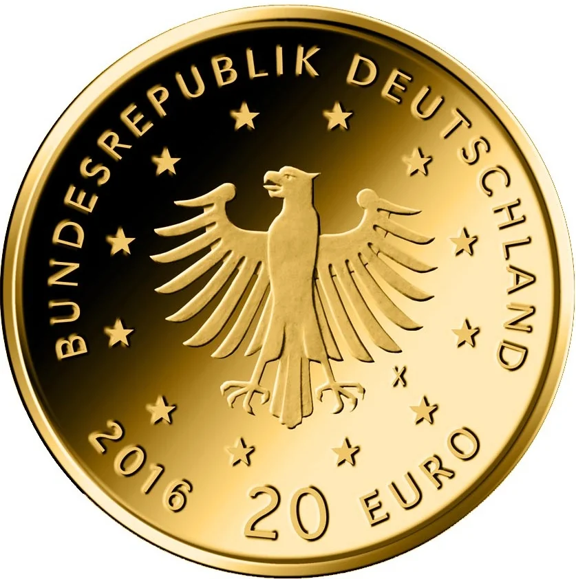 The stylized German Federal Eagle, encircled by the twelve stars of the EU, above "BUNDESREPUBLIK DEUTSCHLAND", the year, mint mark, and face value "20 EURO".