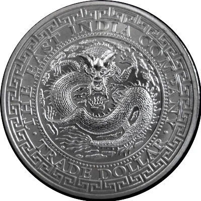 A traditional Chinese-style dragon based on an 1889 silver coin, surrounded by lettering within a scroll-patterned border.