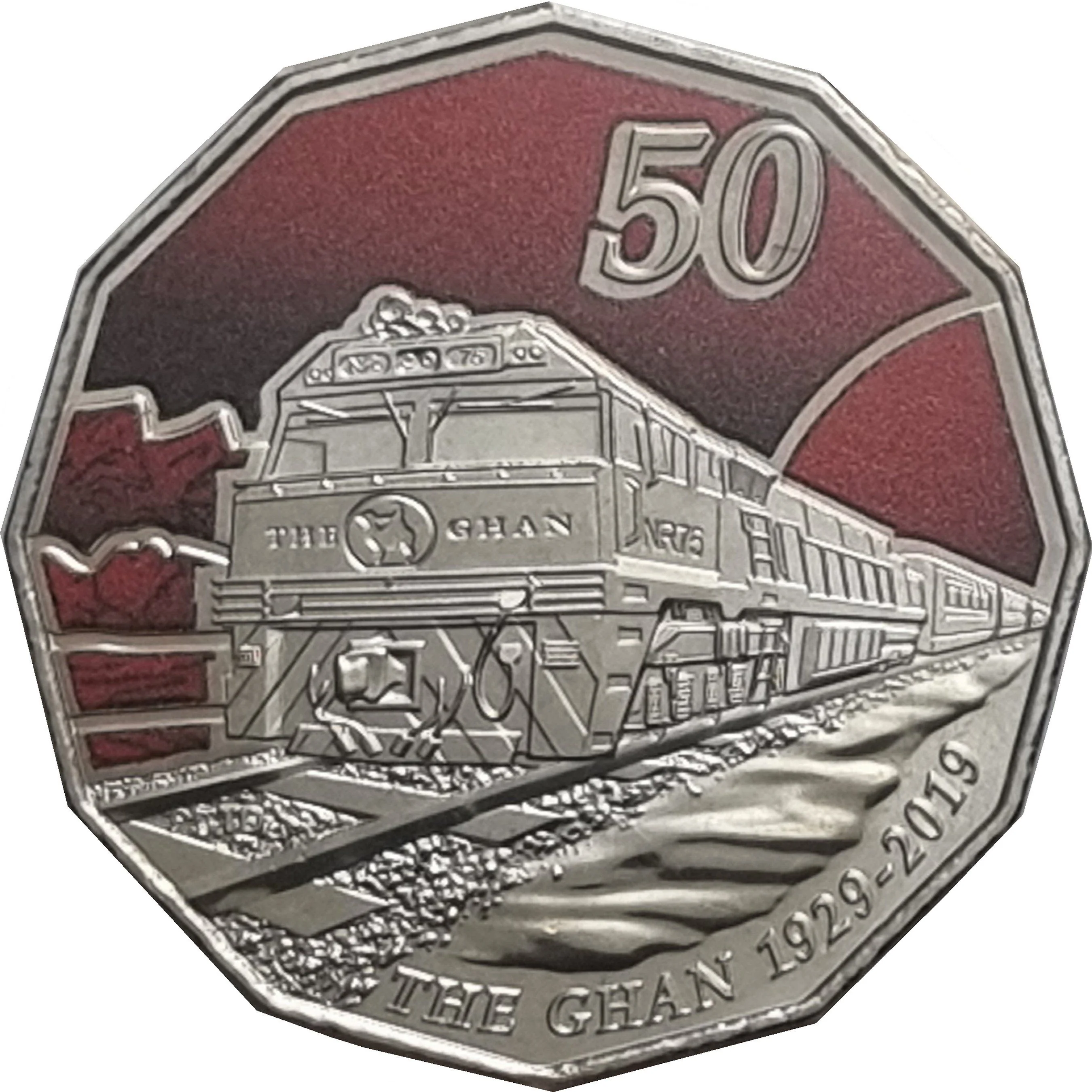 The Ghan locomotive and train on tracks against a red backdrop, above the denomination.