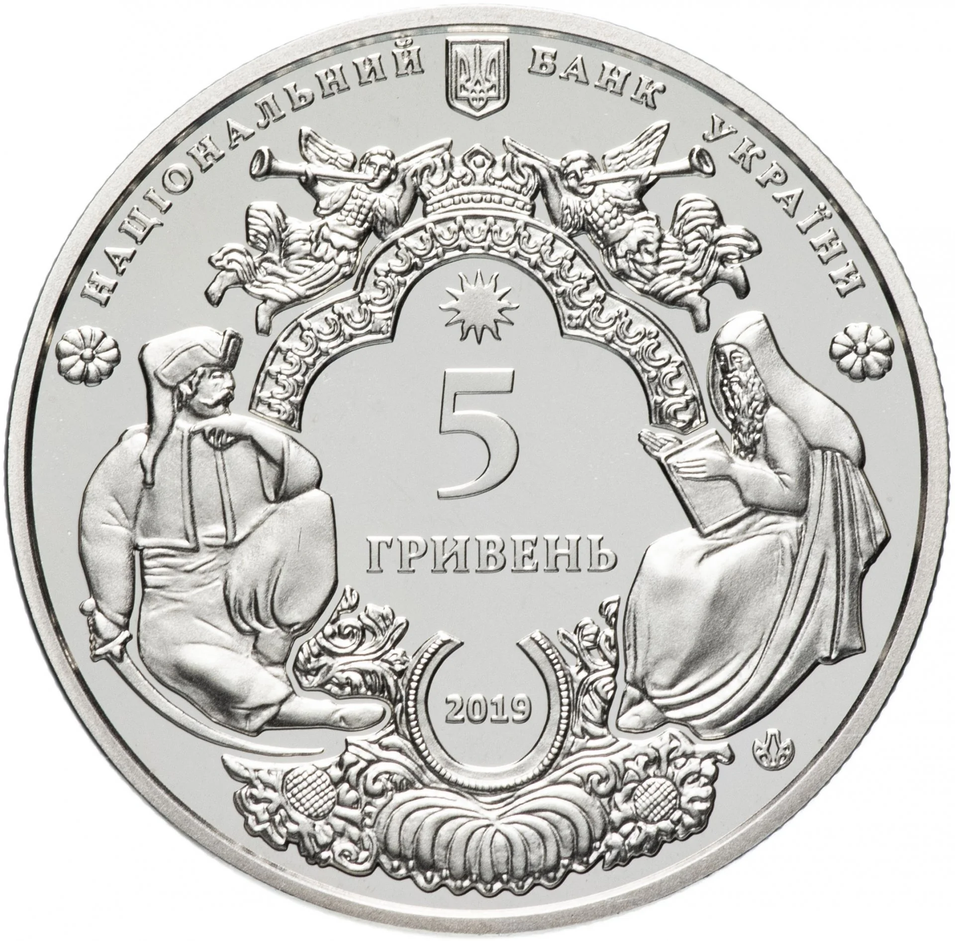 Ukraine's small coat of arms is flanked by the words "НАЦІОНАЛЬНИЙ" and "БАНК УКРАЇНИ". The background features a stylized Cossack and monk with Baroque moldings. The center shows the face value "5 ГРИВЕНЬ" and year 2019, with the NBU mint mark at the bottom right.