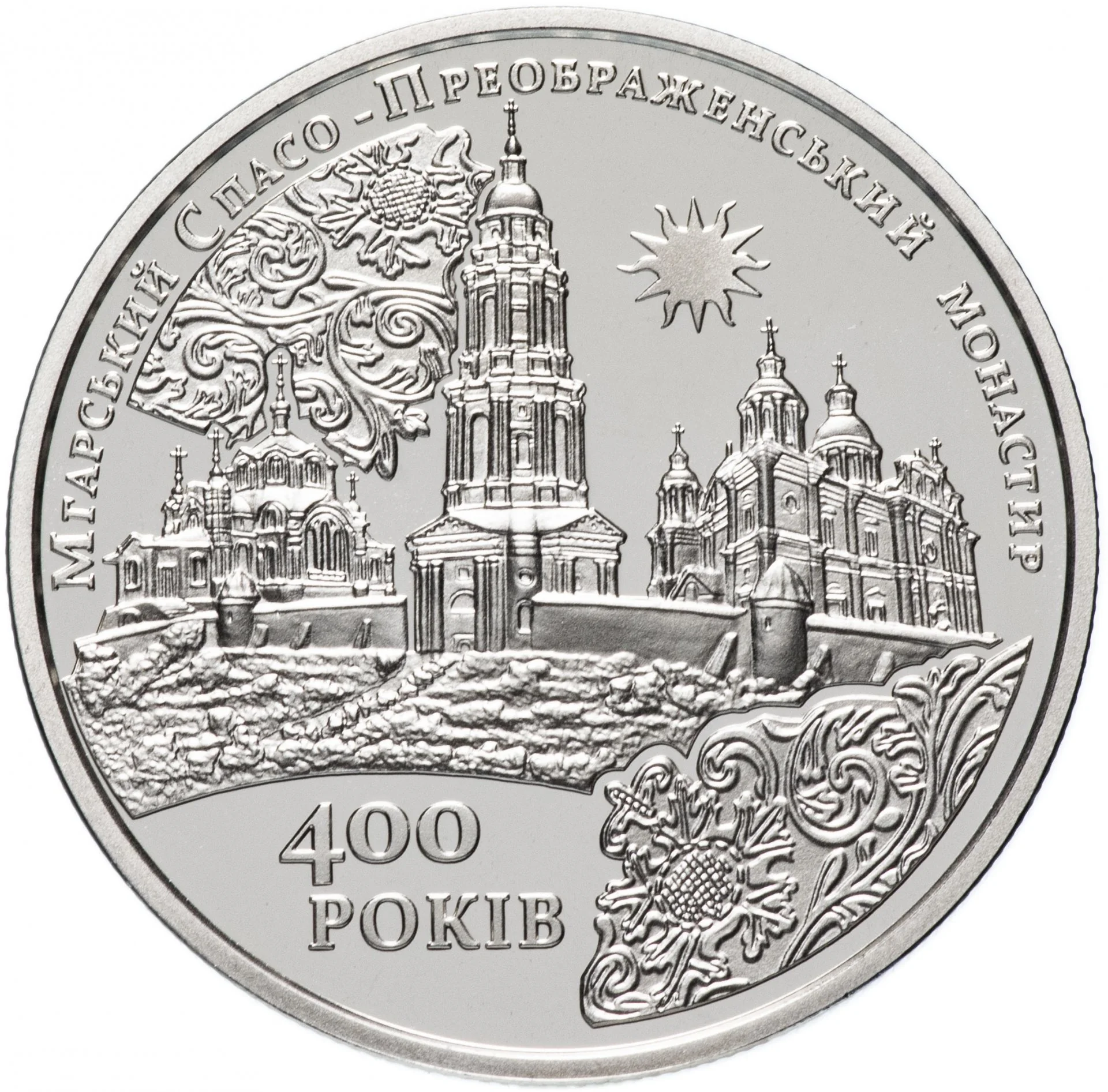 A landscape of monastery buildings with the legends "МГАРСЬКИЙ СПАСО-ПРЕОБРАЖЕНСЬКИЙ МОНАСТИР" (circular, above) and "400/РОКІВ" (below). Baroque floral ornaments appear in the upper left and lower right.