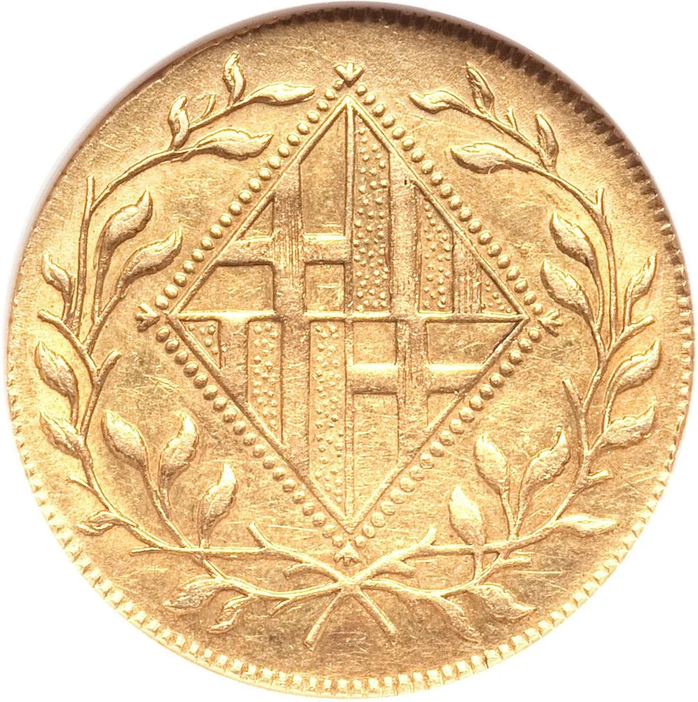 Barcelona's coat of arms in a rhomboid shape, encircled by a wreath.