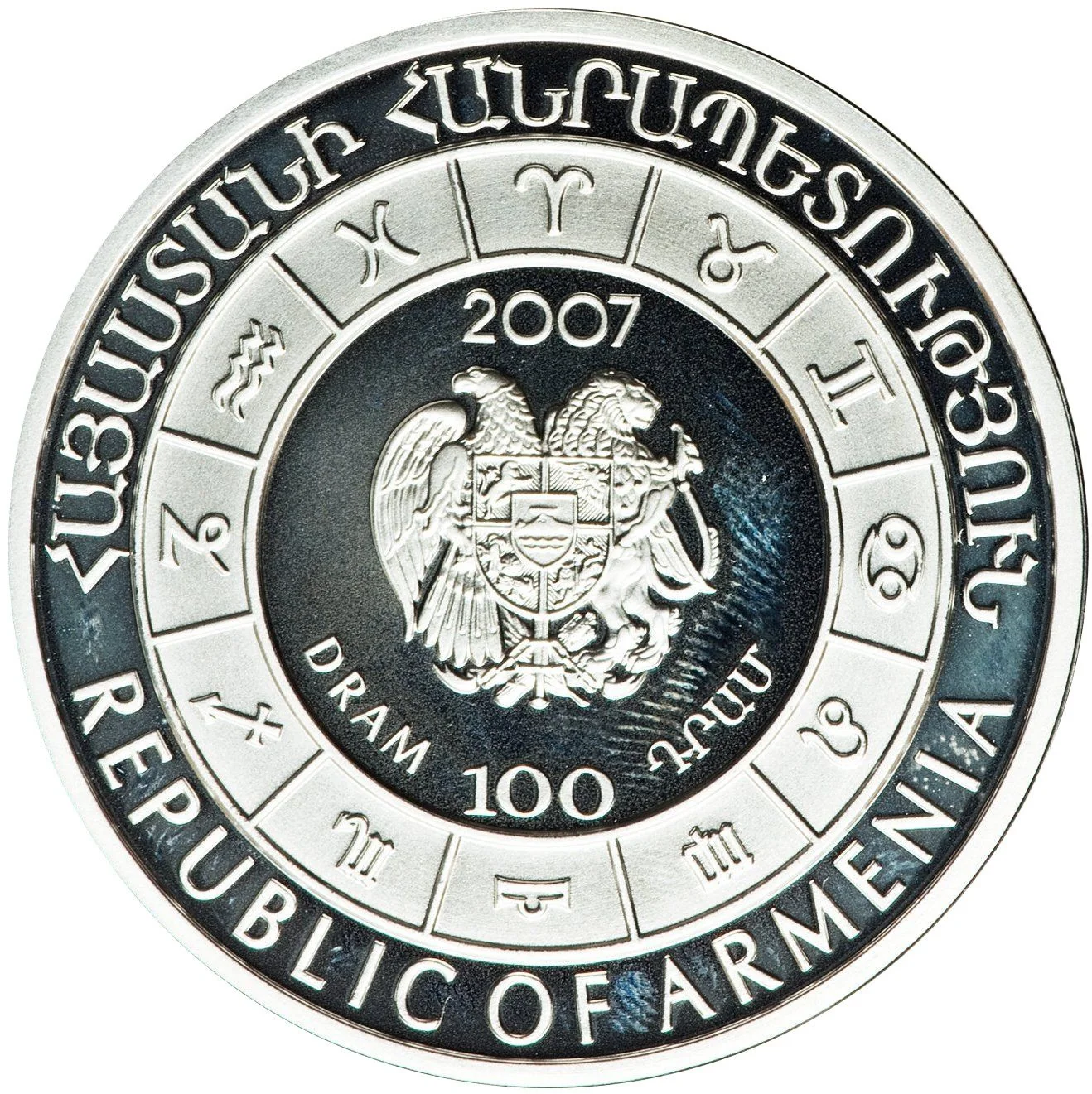 National coat of arms with date above, denomination and Zodiac symbols below.