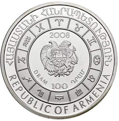 National coat of arms with date above, denomination and Zodiac symbols below.