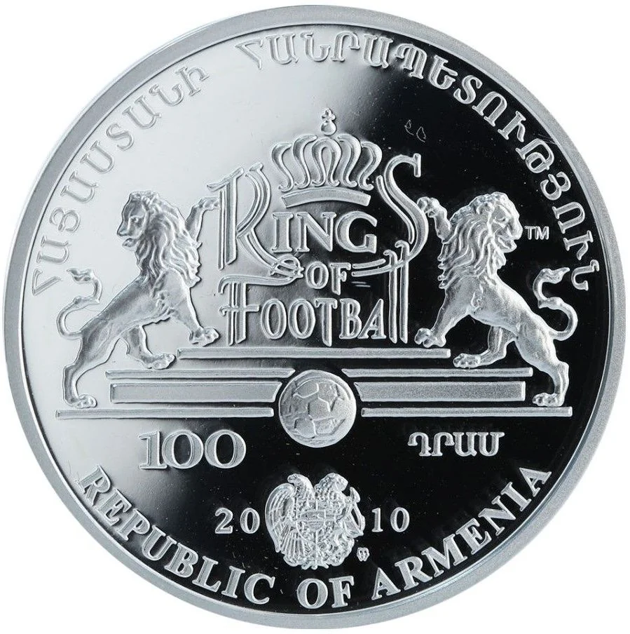 Two crowned lions flank the crowned text "Kings of Football" above a football, with the National Coat of Arms between the date below.