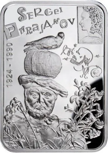 Photo of Sergey Parajanov. Collage frontispiece with camera on tripod and pomegranate. Date and coat of arms visible.