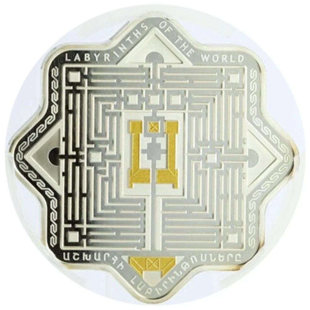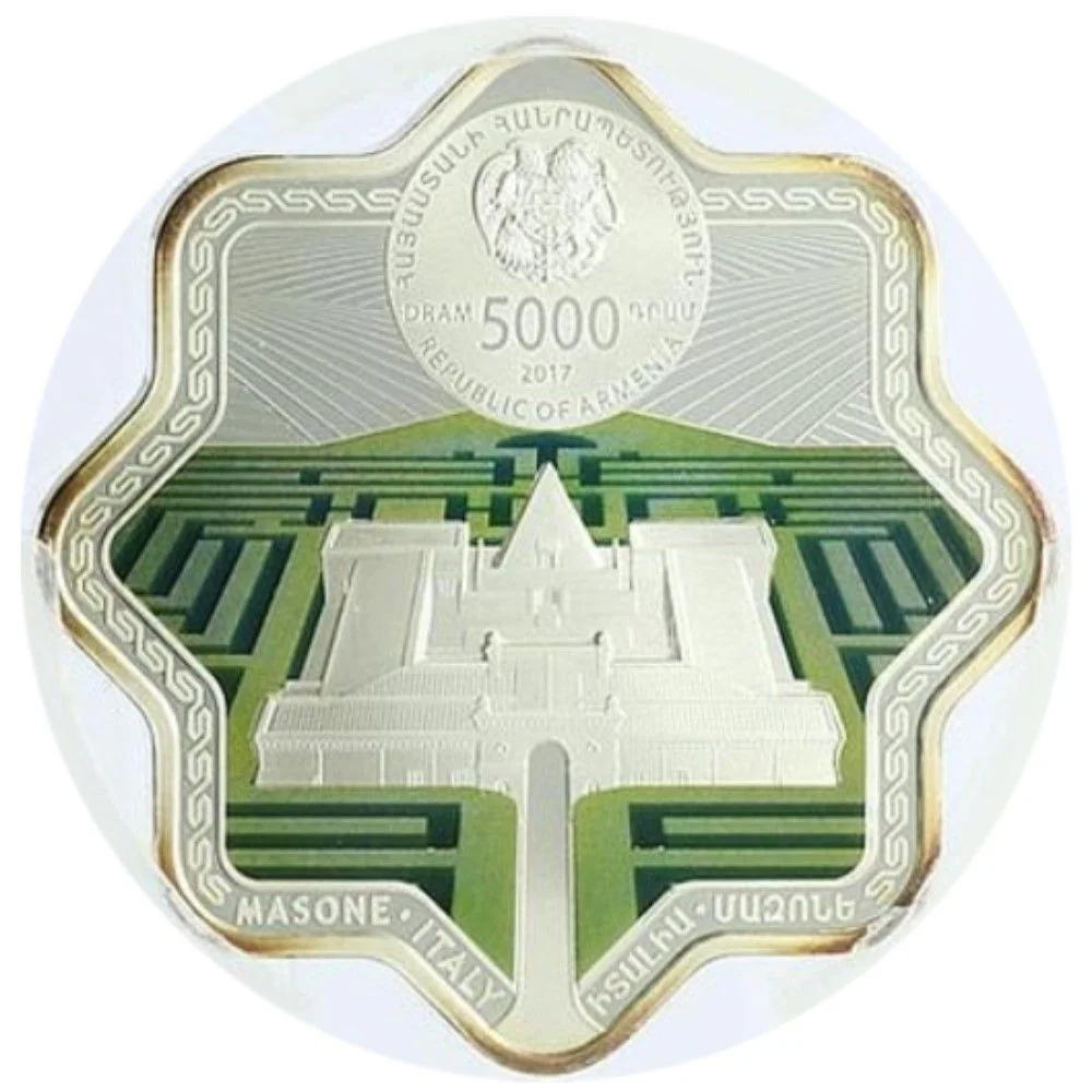 Description: Green labyrinth building with a disc-shaped Coat of Arms, legend above and location below.