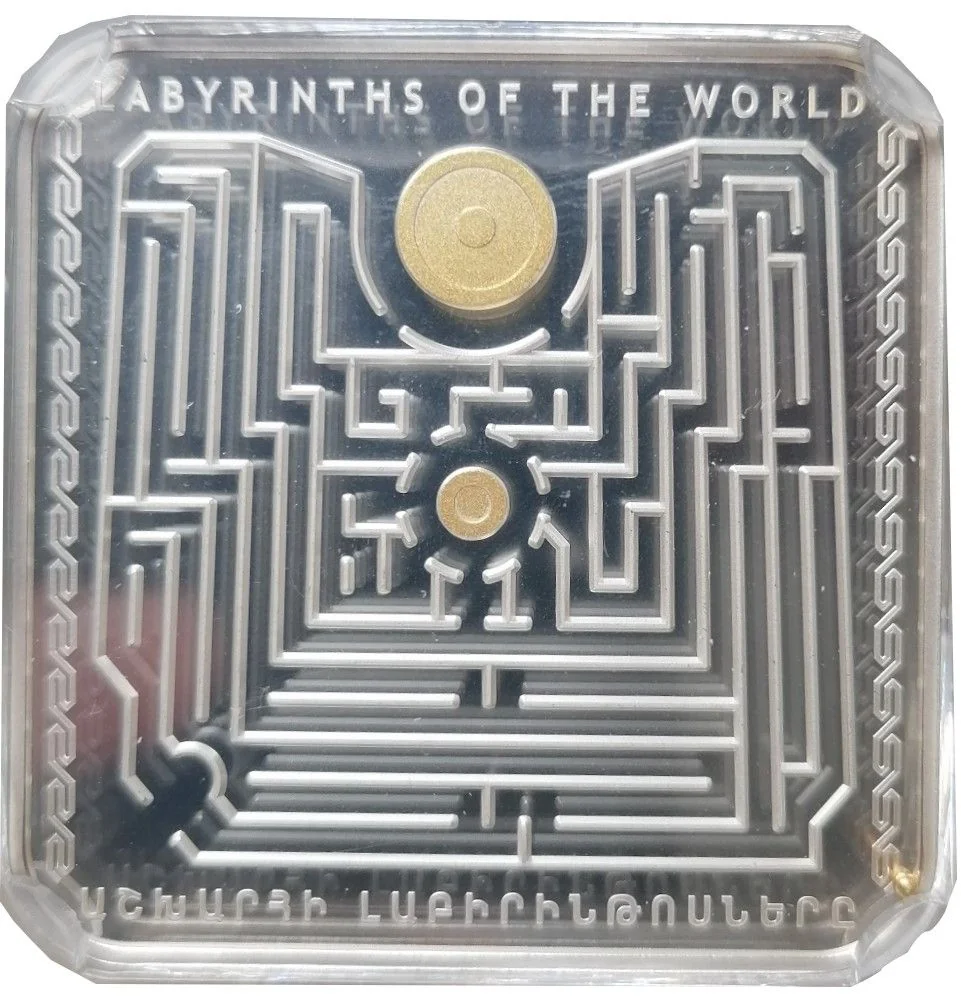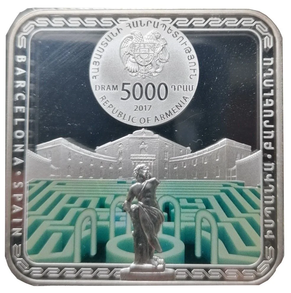 Description: Barcelona’s labyrinth building, featuring a green labyrinth and central statue. A coat of arms in a disc with a legend appears above, and the location is noted below.