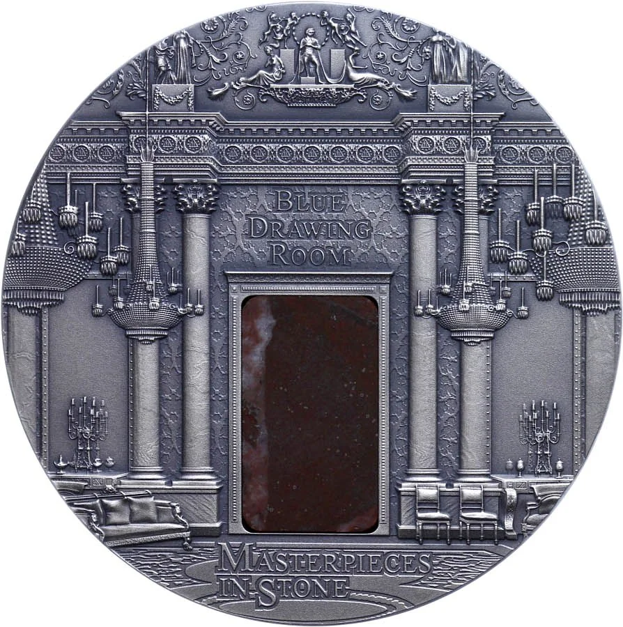 Captures the Blue Drawing Room's exquisite detail and opulence, featuring Rosso Levanto marble.