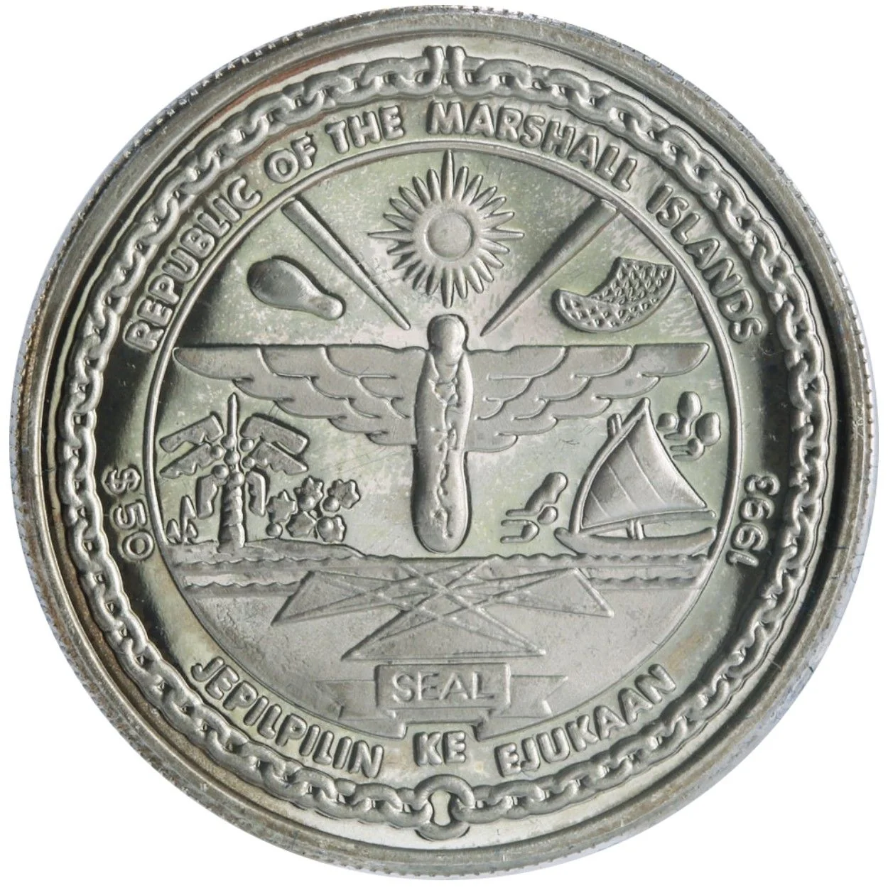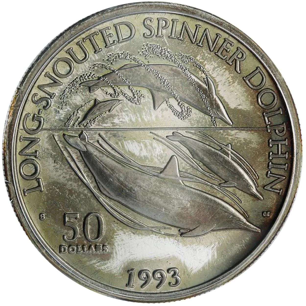 Long-snouted spinner dolphins in open waters, denomination left, date below.
