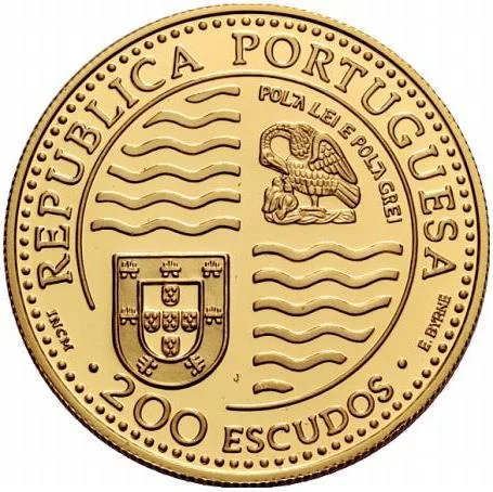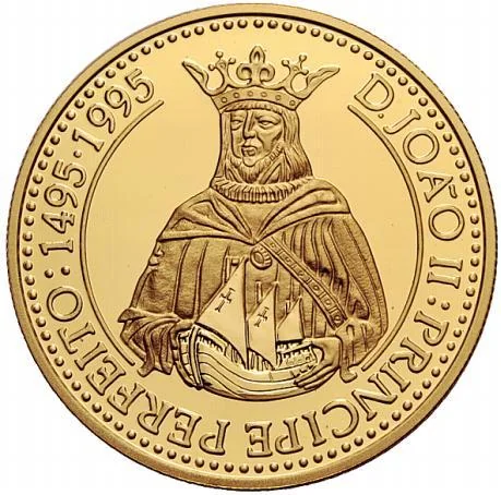 Shield quartered: top left and bottom right feature wavy lines for navigation; bottom left has the Portuguese coat of arms; top right shows King John II's pelican arms with the motto "Pela Lei e Pela Grei". Encircled by country, value, and pearls.