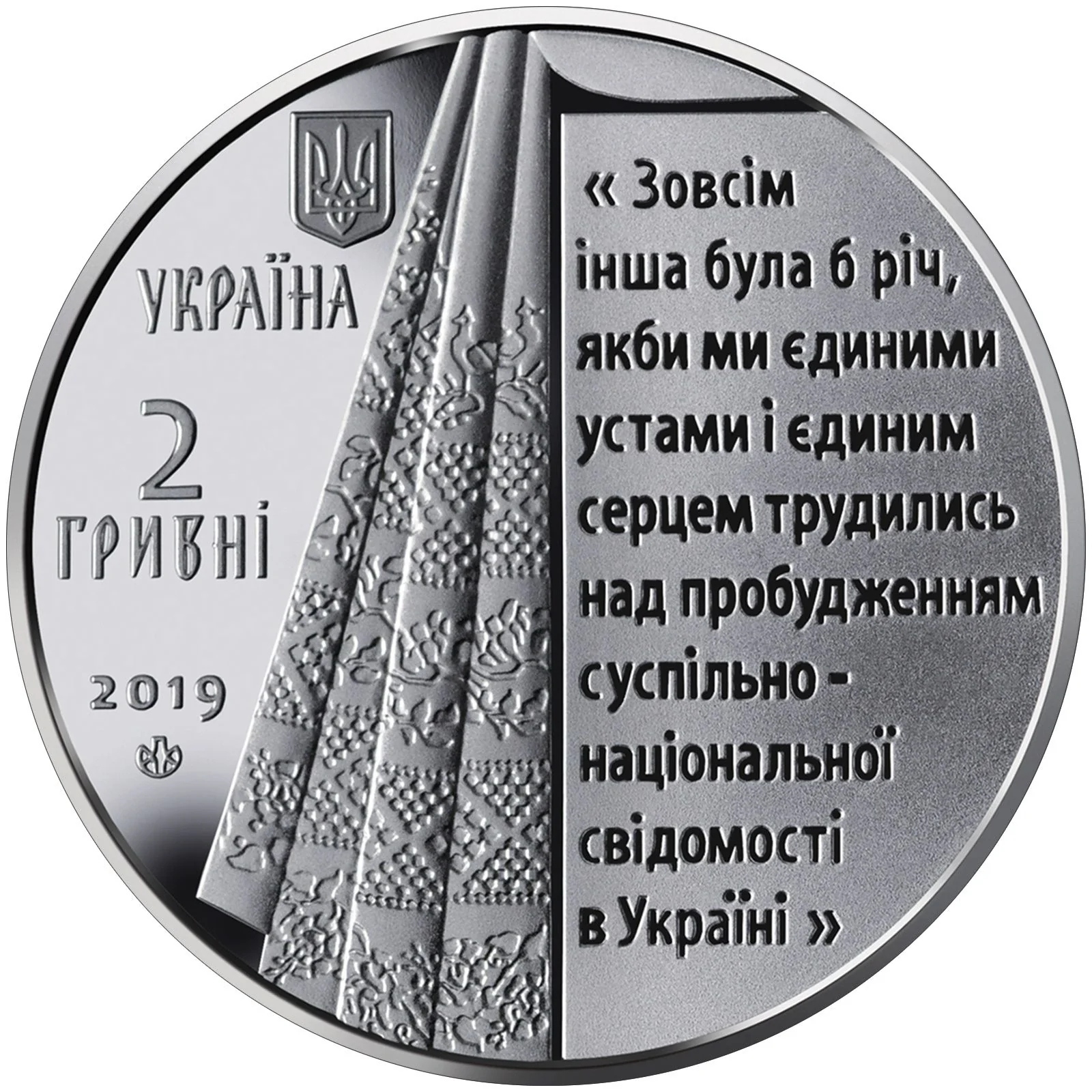 Description: Ukraine's small coat of arms is at top left. Below it, on a plain field, are the inscriptions УКРАЇНА/2/ГРИВНІ/2019 and the mint mark. To the right are an embroidered towel and a quote from Kulish's letter about uniting to awaken Ukraine's social and national consciousness.