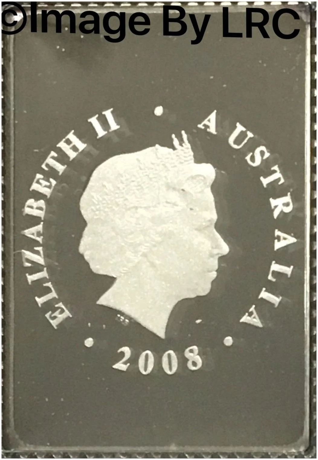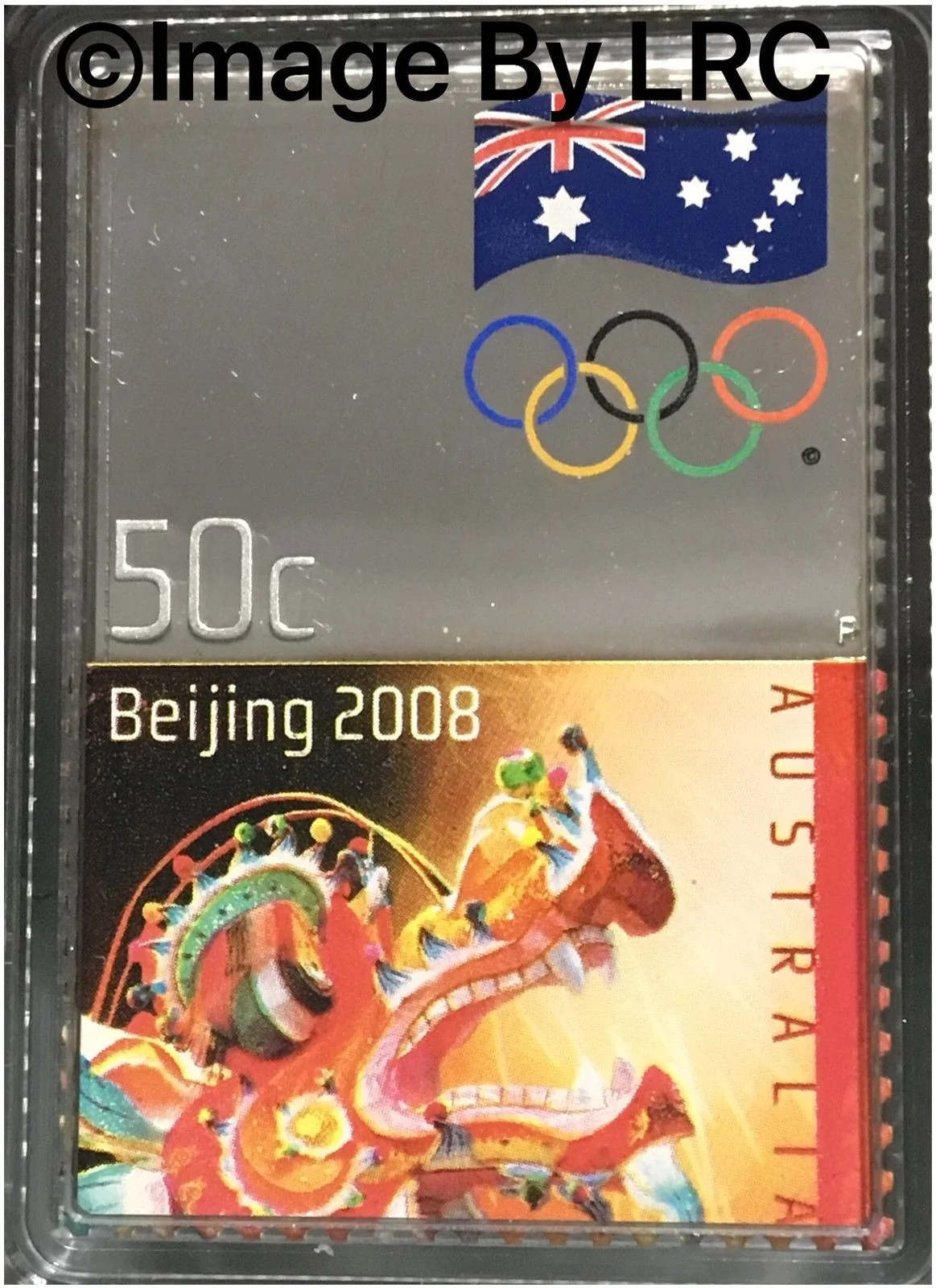 Stamp-shaped coin. Silver top half features a colored Australian Flag above Olympic Rings, with 50c at lower left. Colored bottom half has a Chinese Dragon, "AUSTRALIA" vertically along a red strip, and "Beijing 2008" above the dragon.