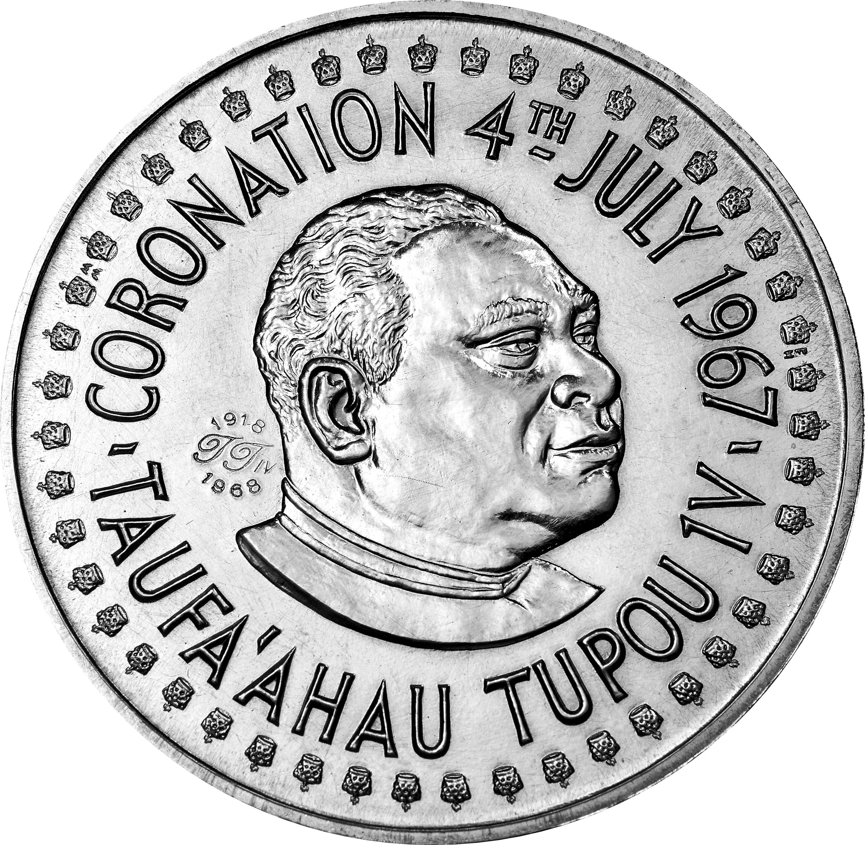 King Tupou IV facing right, with small crowns encircling the border and a countermark to the left.