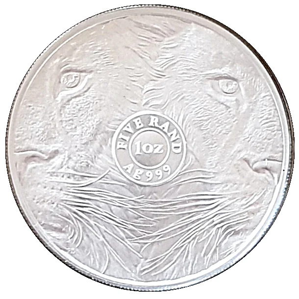 Male lion facing left, South African coat of arms centered below, lettering on both sides.