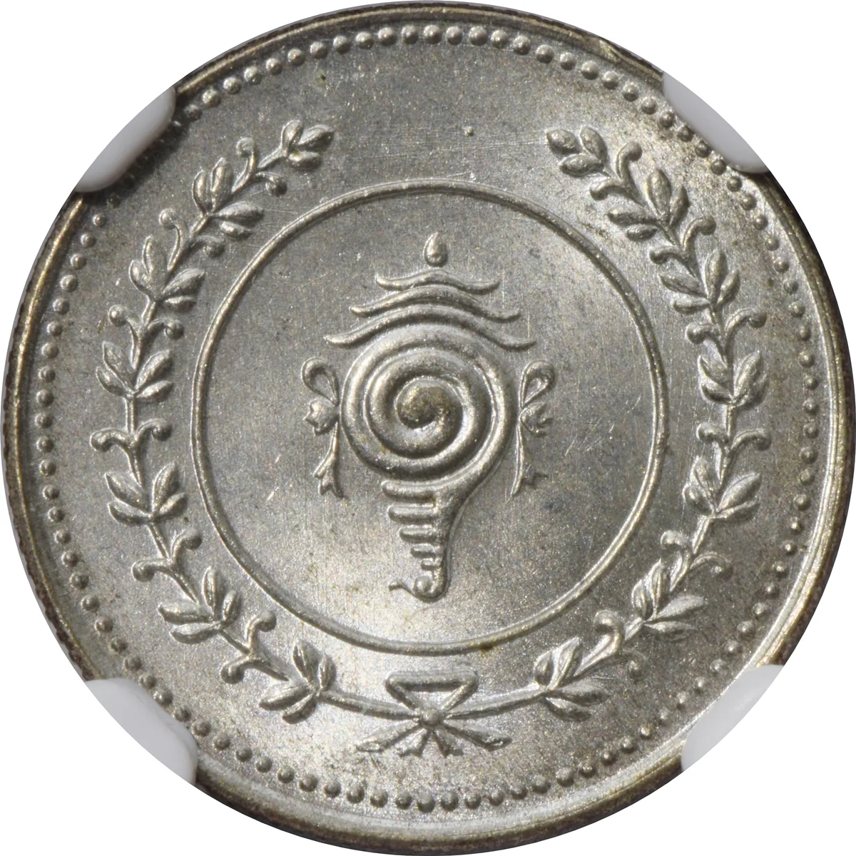 Shanku in a dotted circle, flanked by sprays.