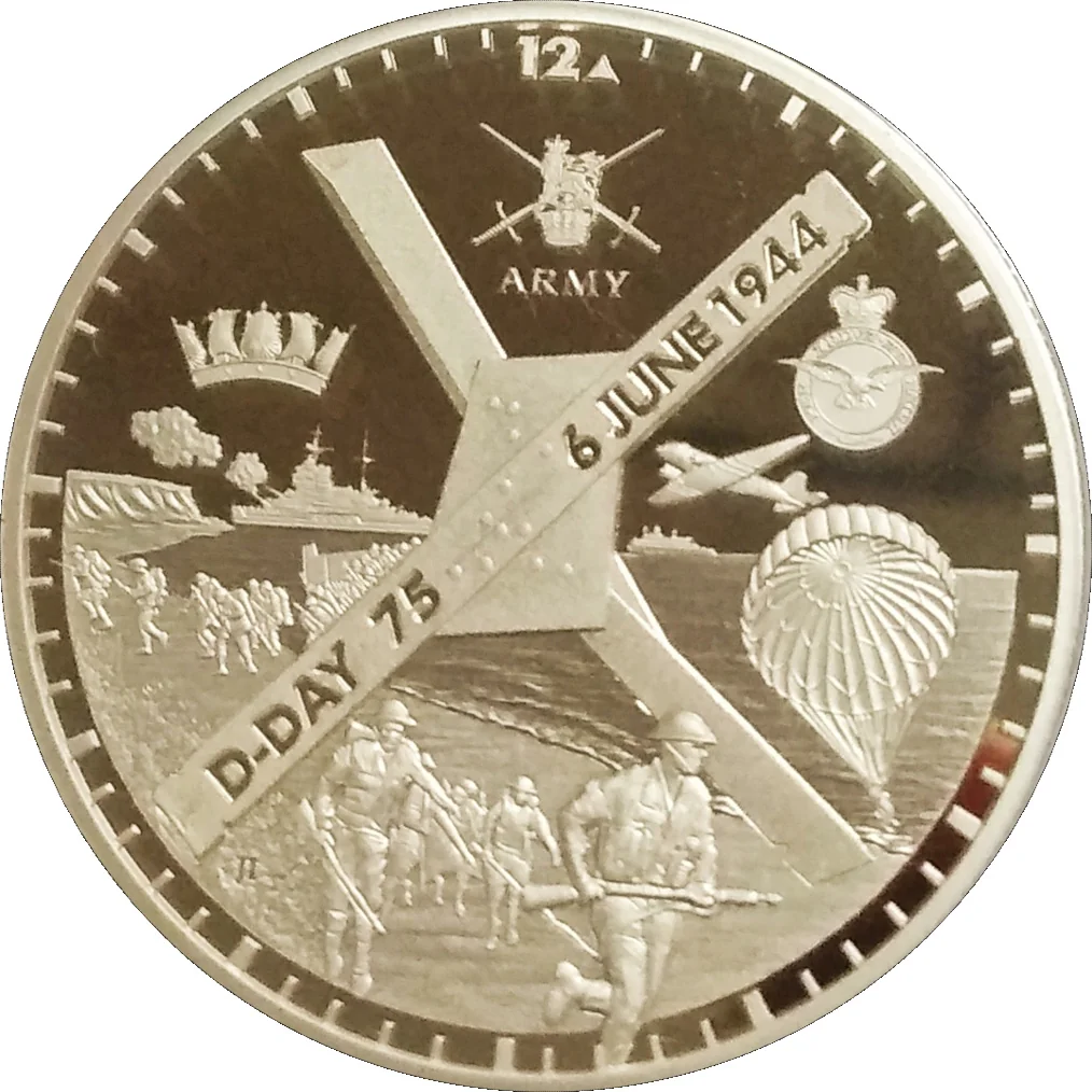 Depicts the D-Day beach landings at midnight, with a Czech Hedgehog flanked by British military emblems.